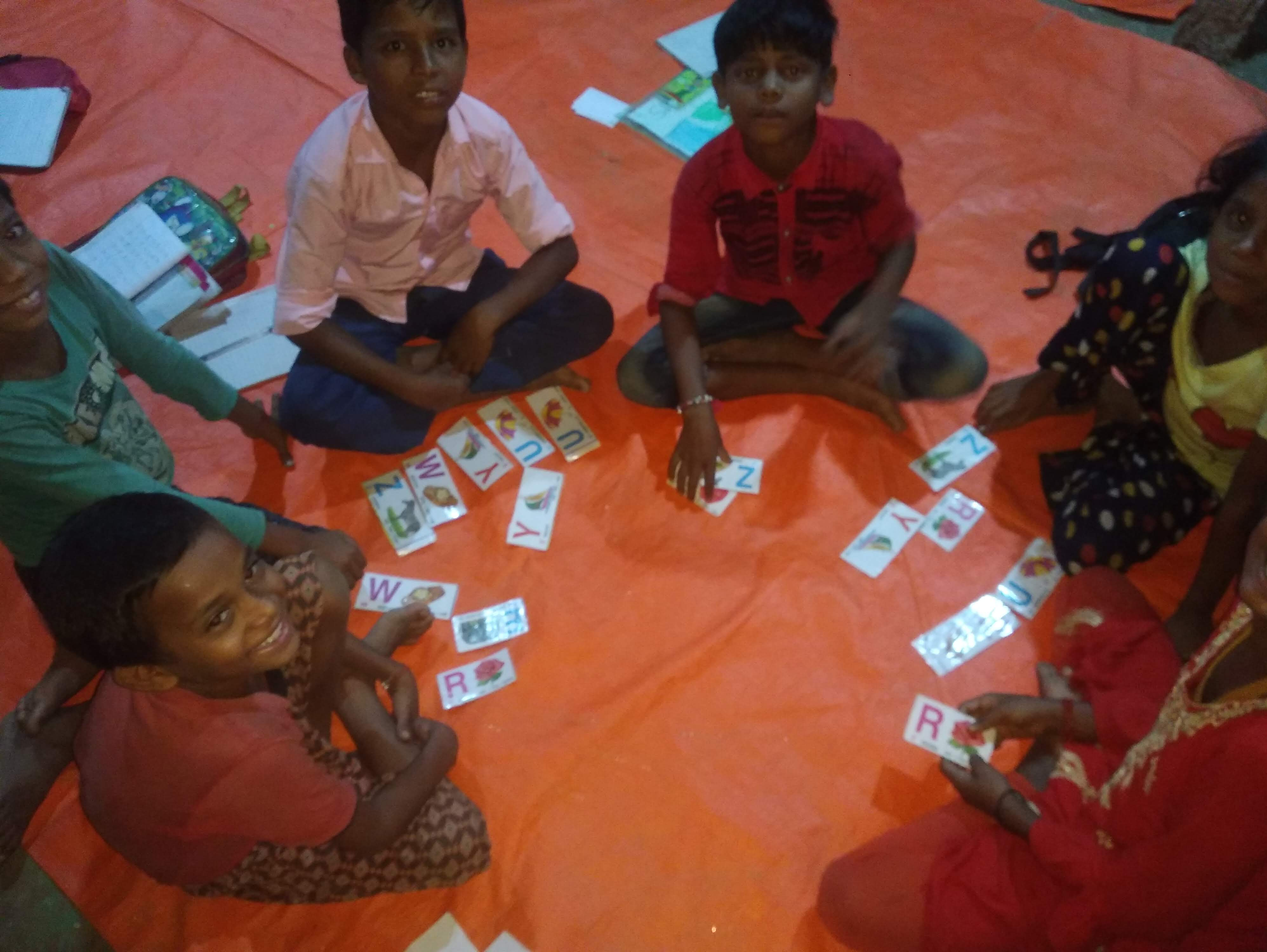 NEW STUDENTS BEING ADMITTED ORIENTATION FOR NEW STUDENTS LEARNING THE ENGLISH ALPHABETS THROUGH A GAME OF CARDS IMMERSION SONGS CONTINUE IN ENGLISH CLASS