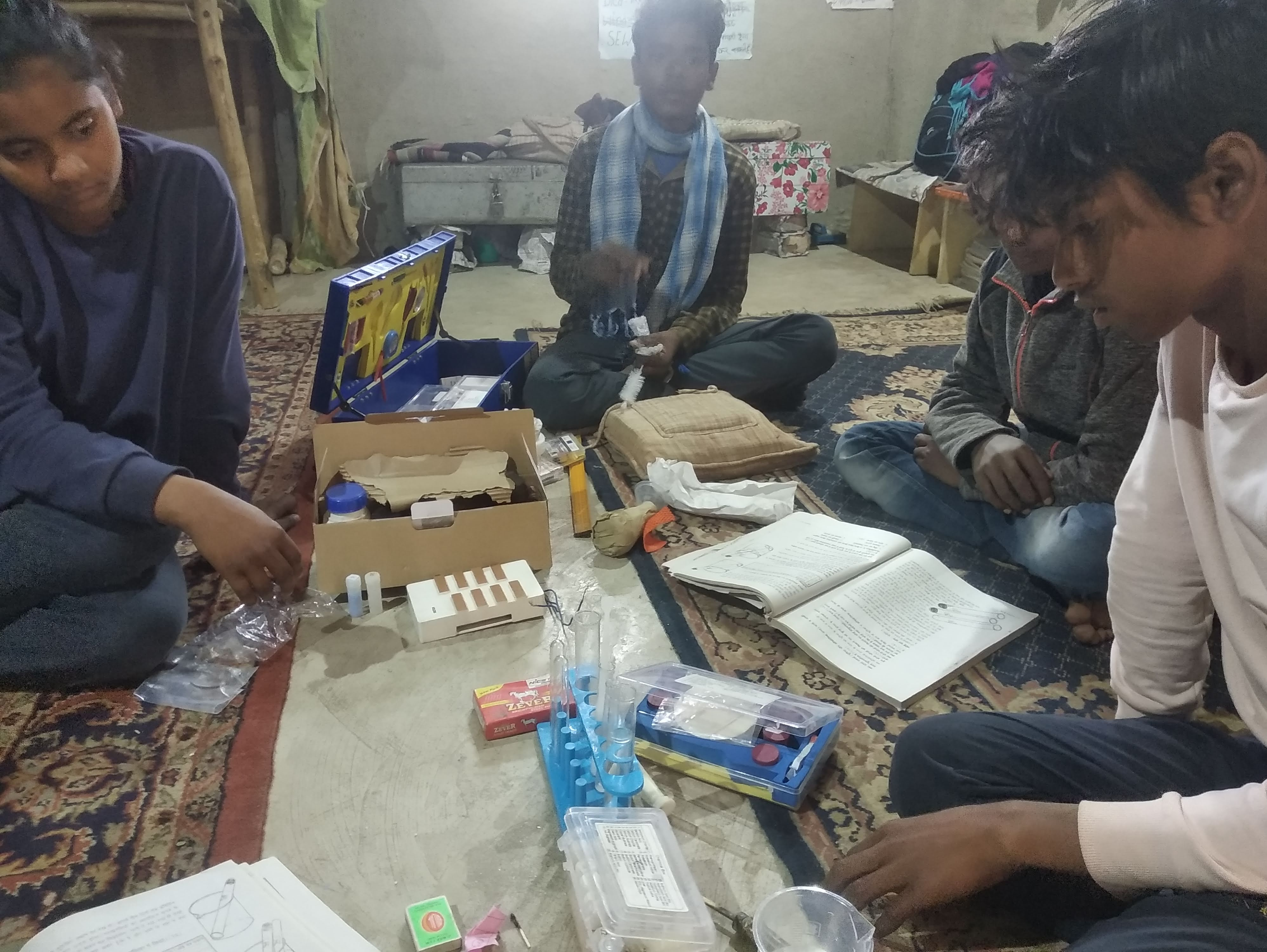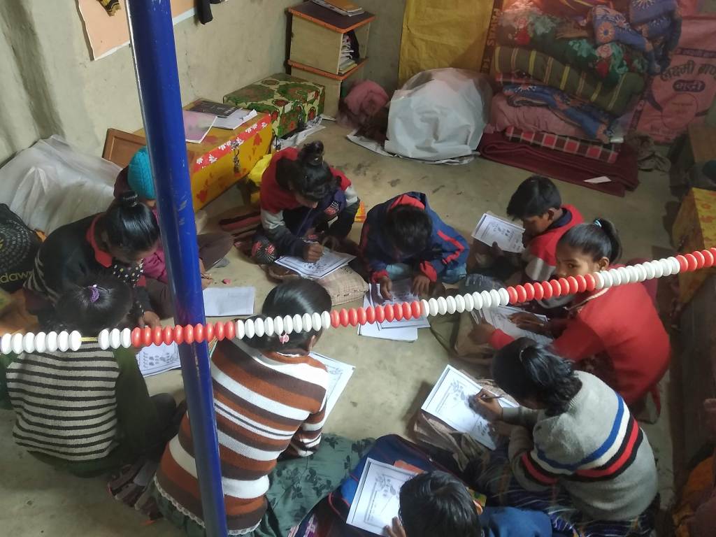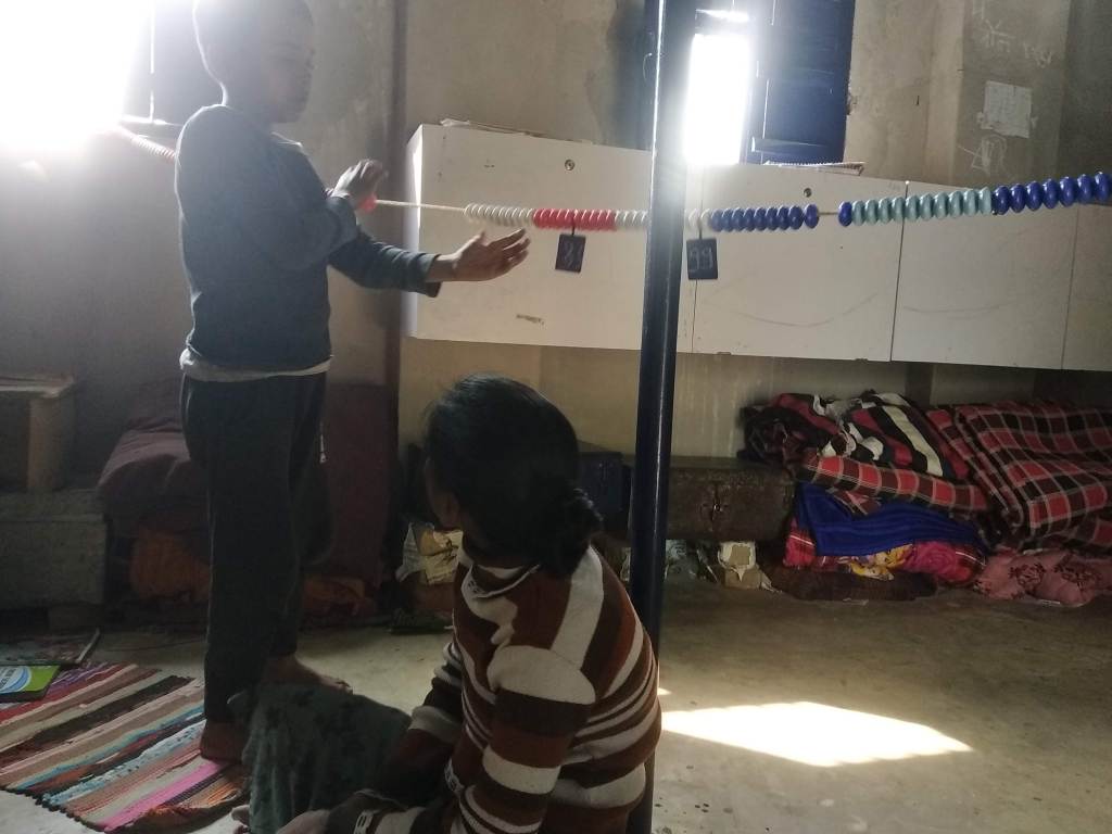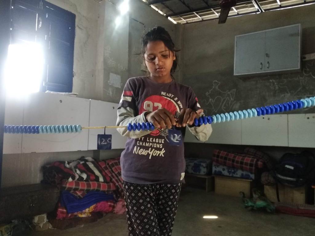 As we can see in the photos above, the “ganitmala” is an integral part of our basic maths classes. Clockwise: shahzad works on the “ganitmala”; the class in the shadow of the “ganitmala”; Siddhi works on the “ganitmala”; Maths assessment being done by TL Priyanka.