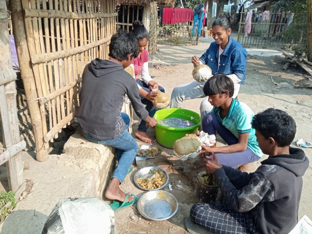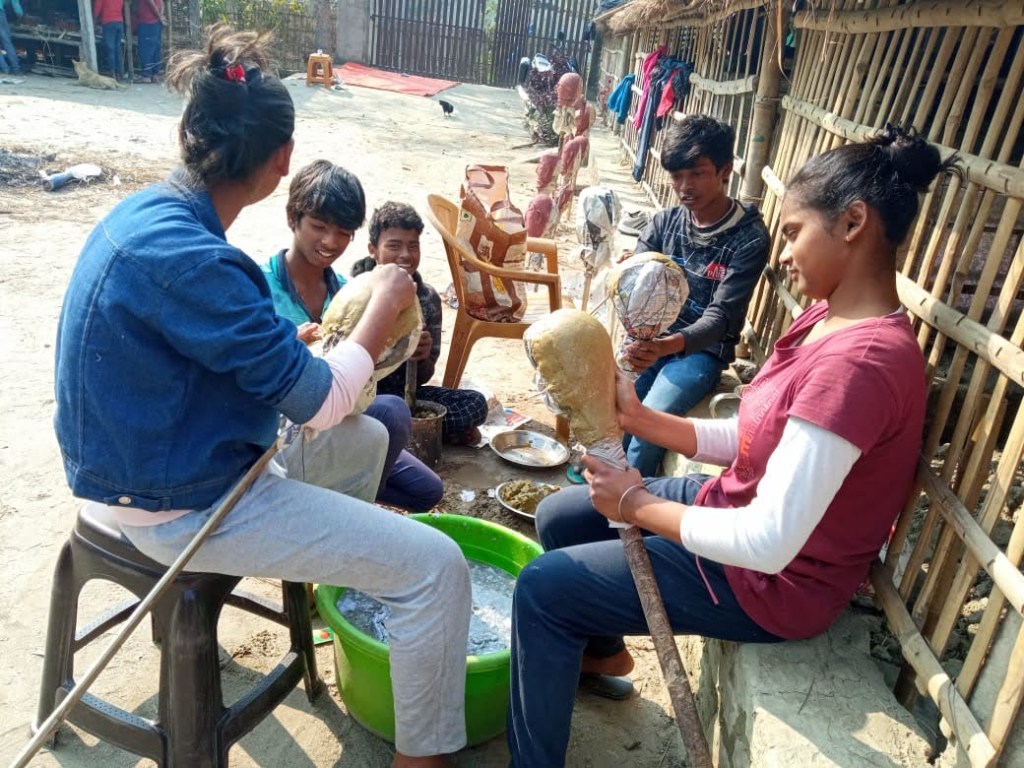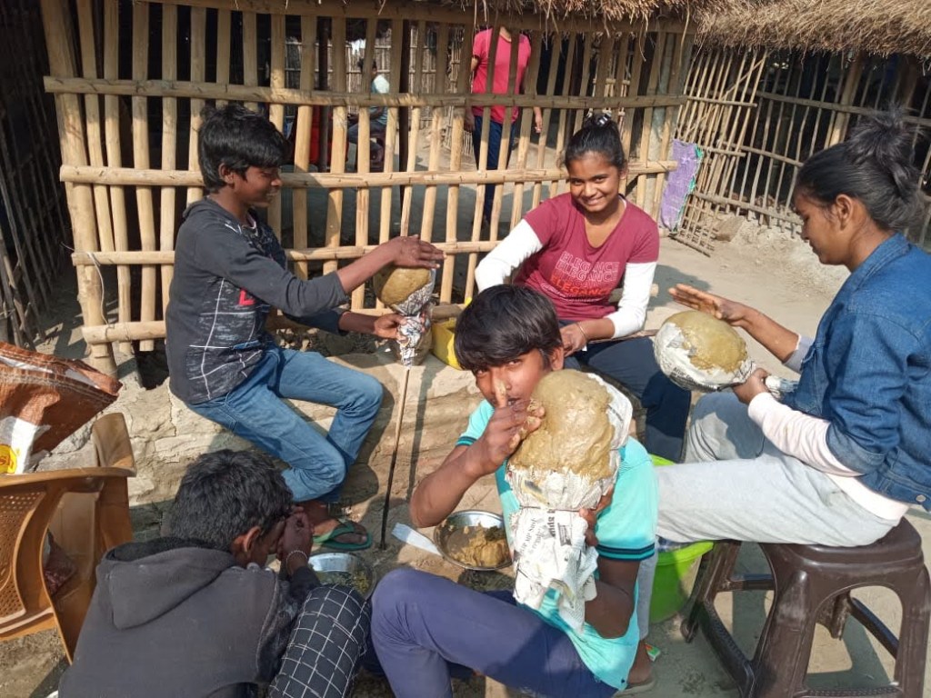 One of the most exciting exercises to happen at the centre, for our children, was the mask making workshop. The senior students, were given a small training on making masks, from old newspapers, by cultural activist Jitendra Paswan. Jitendra is a former Sarpanch from Katihar and also Secretary of the JJSS. He is active with social causes. Here is one scene, captured over a few photos…