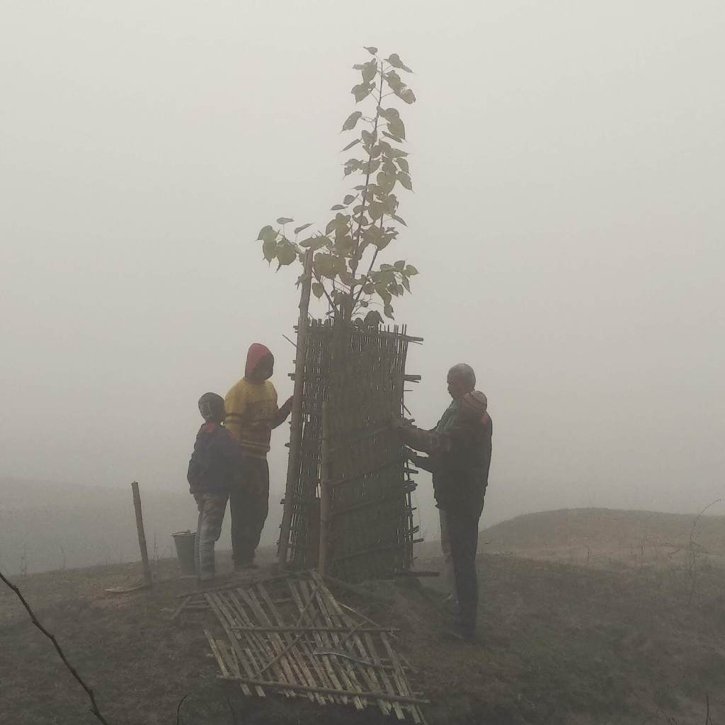 The winter is no deterrent to our shramdan, children working along with Arun ji, to protect the peepul tree planted behind the centre.